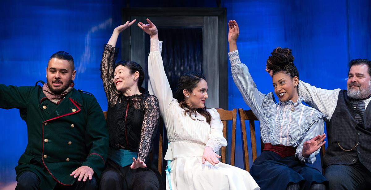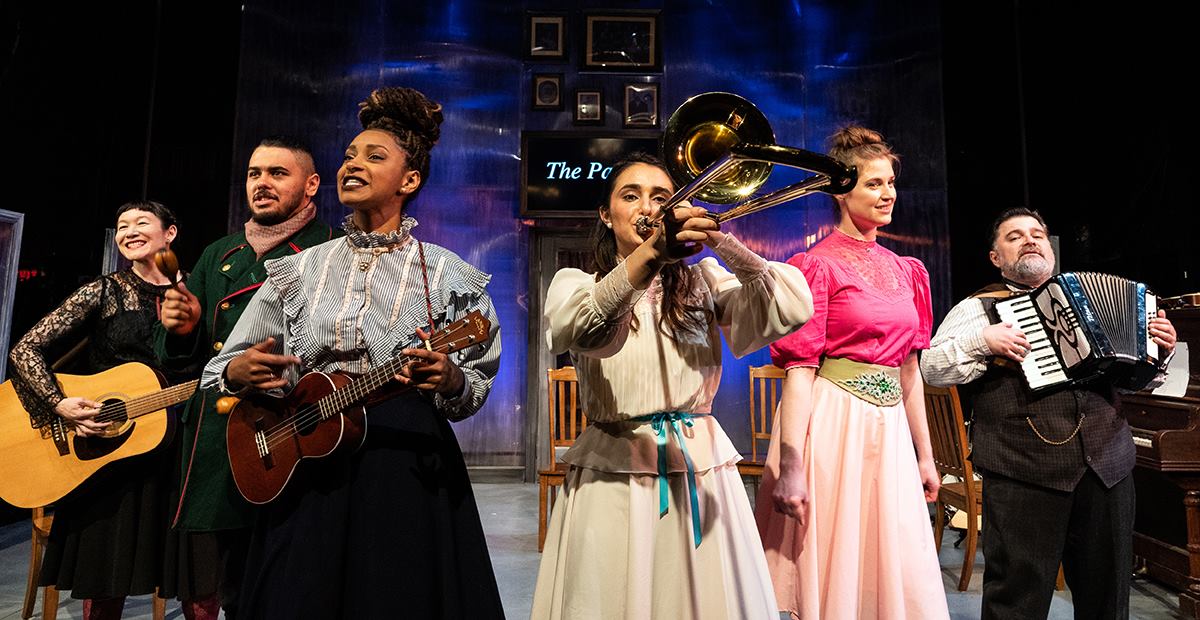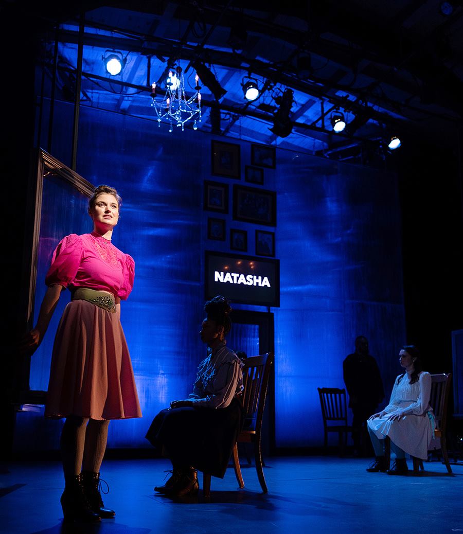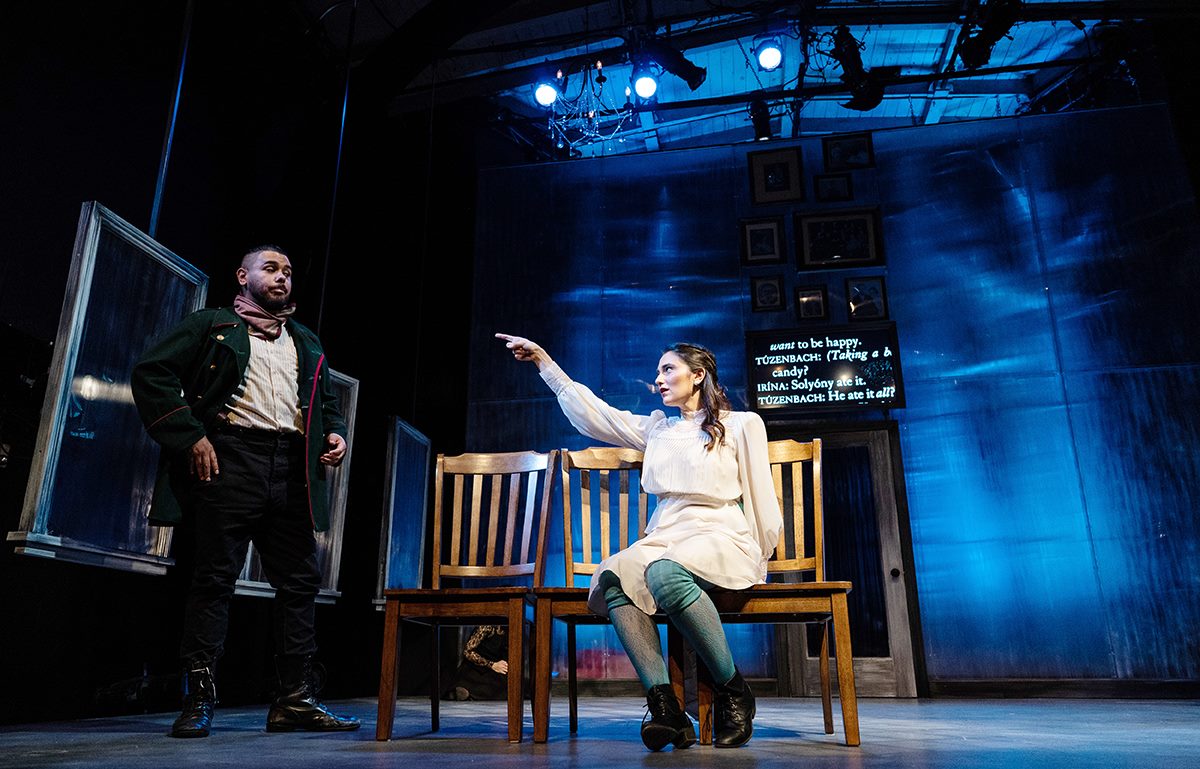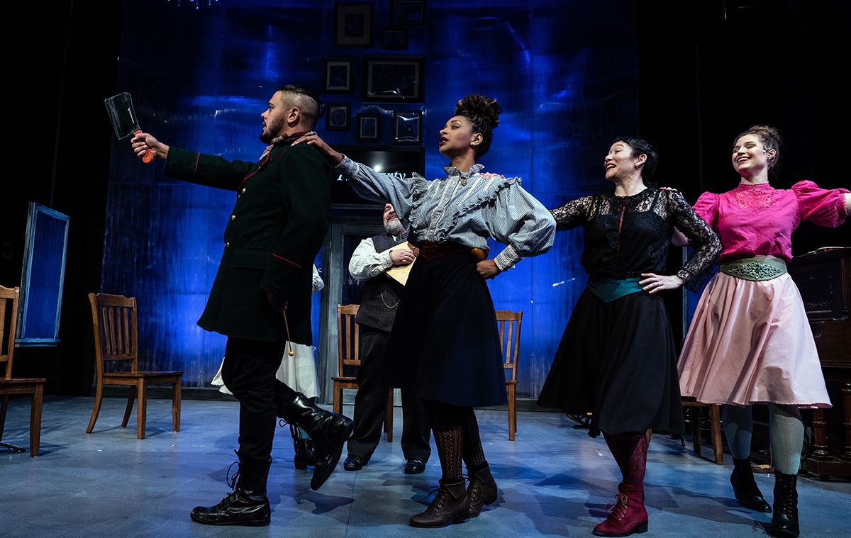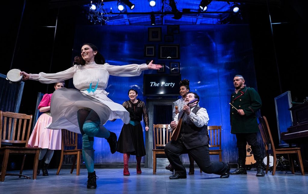 Stuck in the past, the Three Sisters yearn for Moscow, for city life. Their socially awkward city-based sister in law Natasha (dorky Amanda Farbstein) adds to their envy. Watch for a single accordion, a butcher’s knife, and tying a cherry stem with your tongue—like circus marvels. But the multi-talented crew sings, dances, and leaps into the air to express frustration—it’s the end of old ways. A revolution is coming.