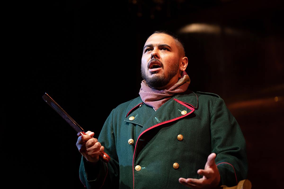 Soldier Solyony (intimidating Nathaniel Andalis) suffers unrequited love for Irina. His fears force him to remove any rival, including a fiance and father. Solyony spritzes his hands with antiseptic to remove the smell of death.