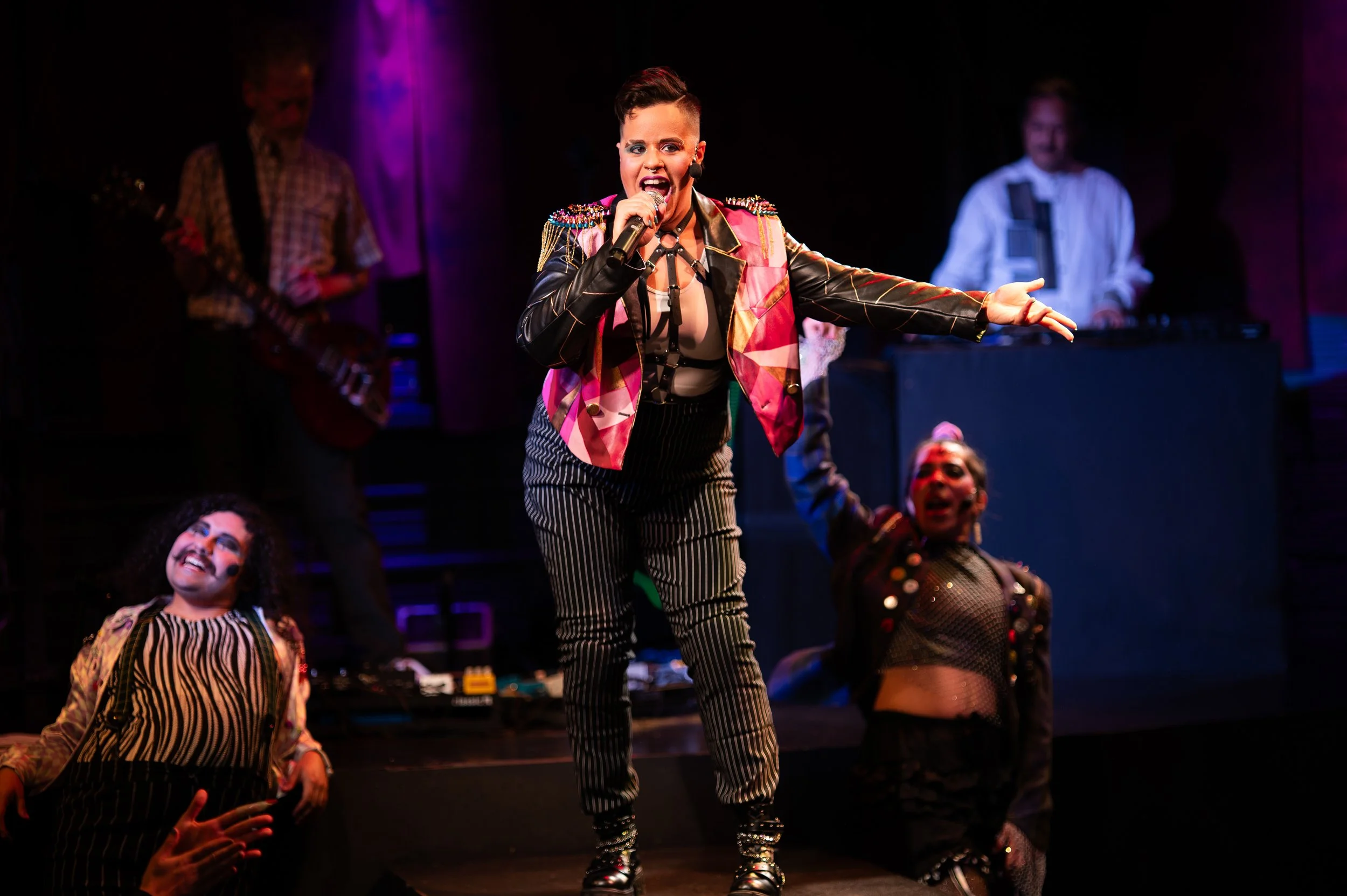 MC Deanalís Arocho Resto grabs our attention with a rousing version of “Willkommen.” Resto’s voice ranges from stunning to powerful to terrifying, as notes slide from shriek to command. Her comic transformation of “If You Could See Her” makes us roar with laughter.