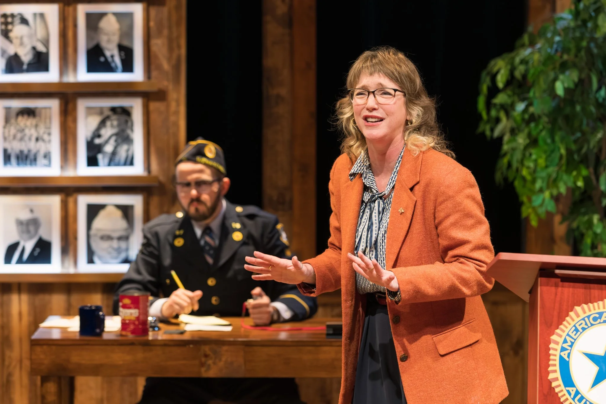 The plot is simple. Fifteen-year-old Heidi is competing in a debate contest at the local American Legion Hall. She is competing to earn money for college tuition, eager to show her smarts. She stands at the Legion podium and behind her are hundreds of photos of photos of white, male Legion heroes. They are represented by one live Legion member played wittily by Vincent Randazzo.