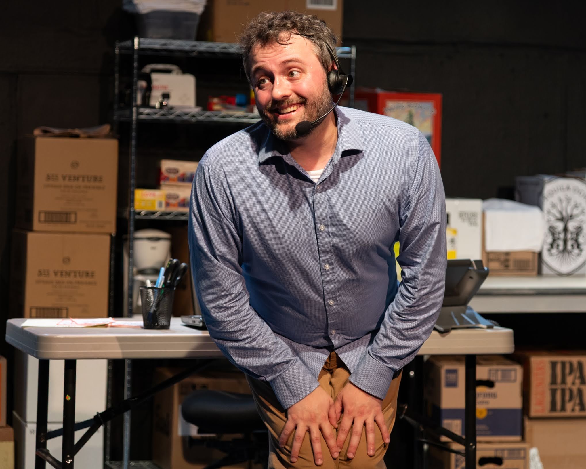 “Fully Committed” by Becky Mode, directed by Kimberly Ridgeway, set design by Tom Curtin, lighting by Stephanie Anne Johnson, sound by Alex Fakayode, costume by Katina Psihos, at Altarena Playhouse, Alameda California.