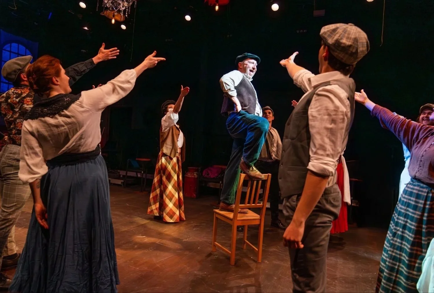 The ensemble thrills, sporting many hats, including a large white flower hat and a baby bonnet. Some actors double as musicians. Their skills shine when playing instruments, along with singing, dancing, and acting!