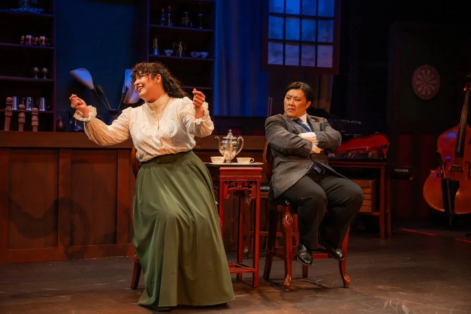As Henry Higgins, Melissa Mei Jones embodies his rational, logical, and blunt personality. I love Jones’ gender-bending role, casting a critical lens on “Why Can’t a Woman Be More Like A Man?” As Colonel Pickering, Thomas Nguyen creates a stellar portrait of Higgins’ sympathetic sidekick. Jones and Nguyen make a comradely bantering duo.