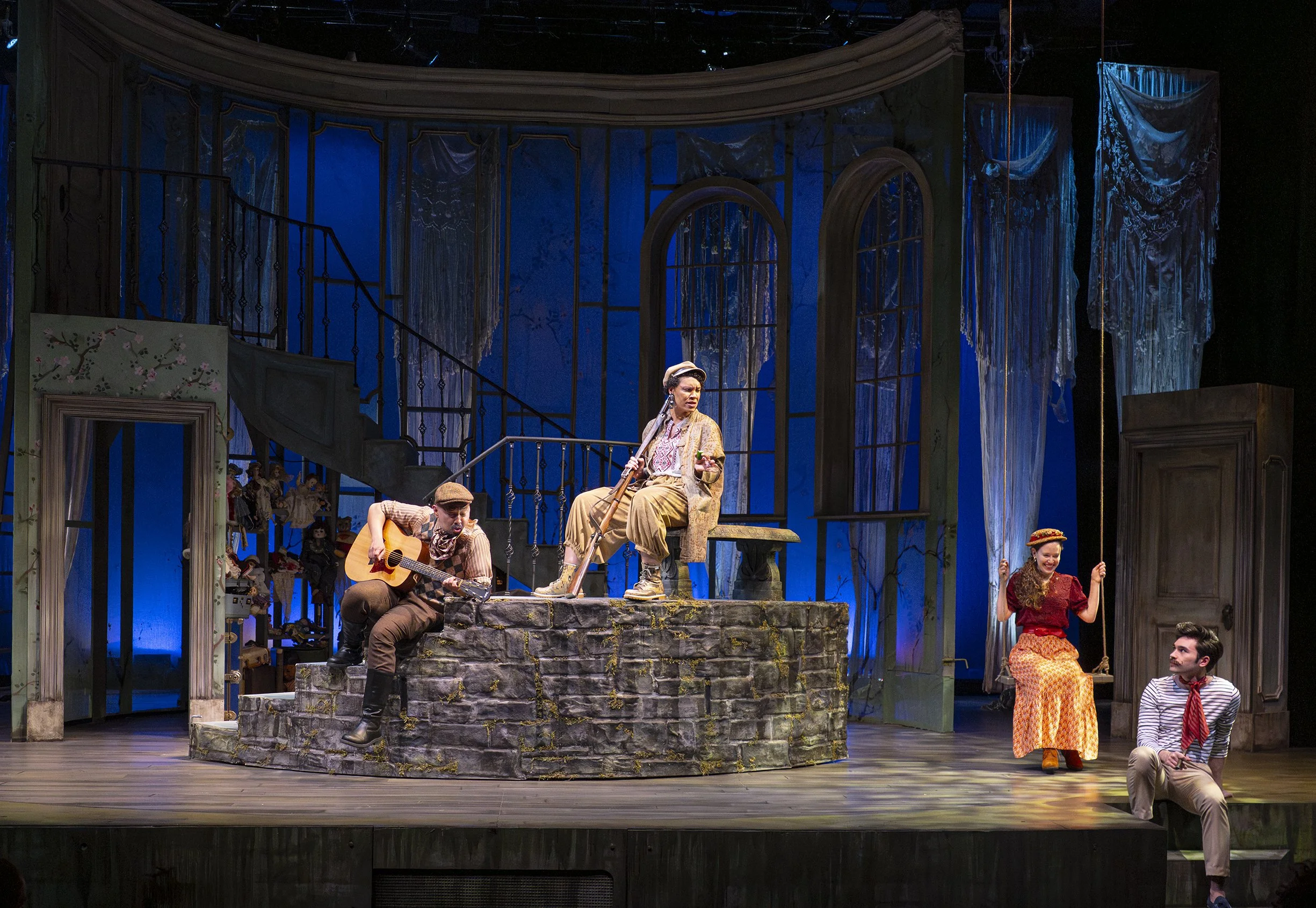 As Carlotta, the clever German governess, Leontyne Mbele-Mbong captivates with sleight-of-hand tricks, her luminous voice, and spectacular costumes. Danny Scheie and Joel Morel deliver witty lines with dexterity. They invite us to join them in thumbing their noses at the idle rich while they cling to Kardashian “elegance.”