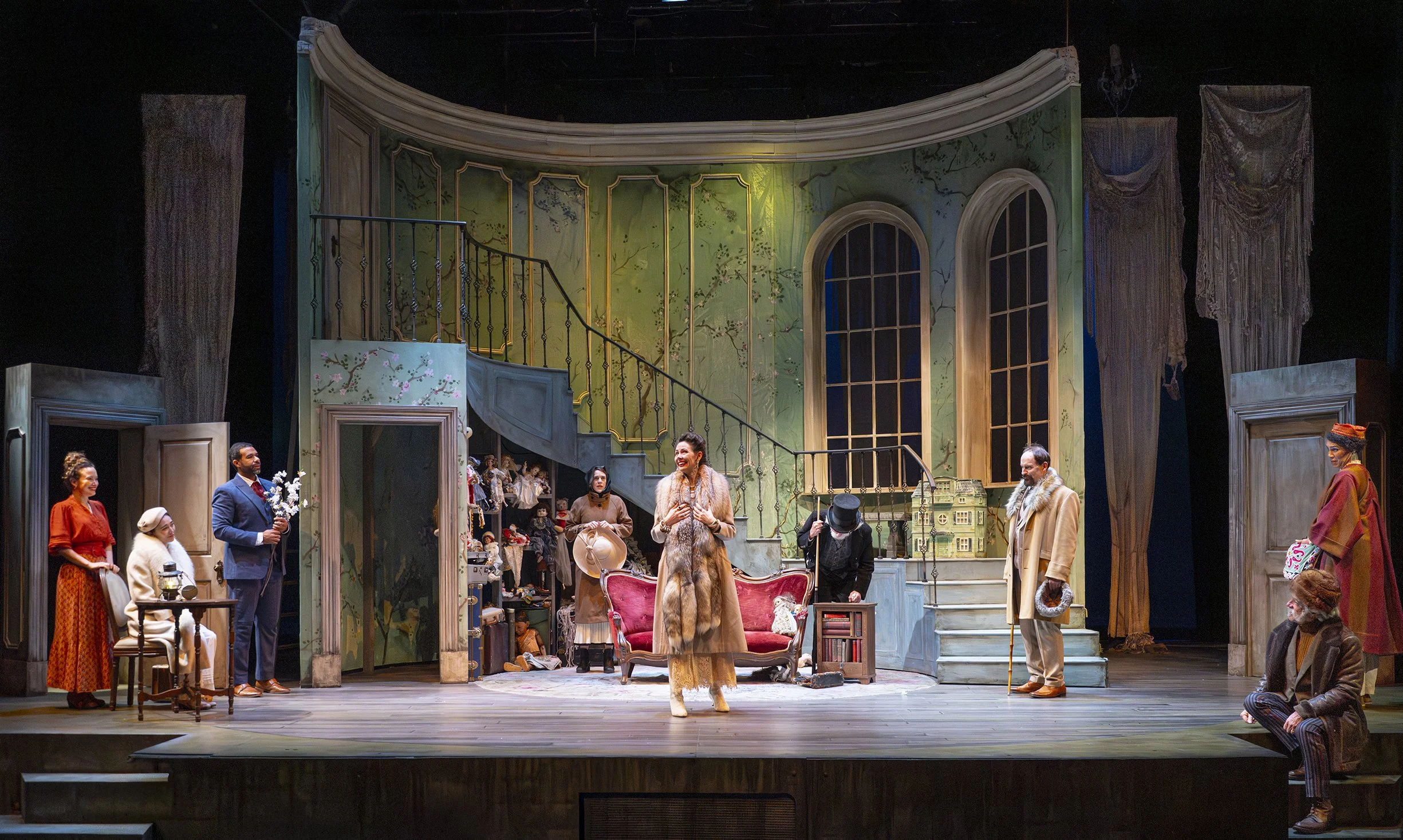 Nina Ball’s stunning set transforms from a nostalgic Victorian nursery to a backlit orchard. When front-lit, the painted walls become transparent, revealing ivory curtains with fringed Empire swags. Ball’s curtains resemble a cherry orchard in bloom, part of a brilliant and shocking “final curtain.”