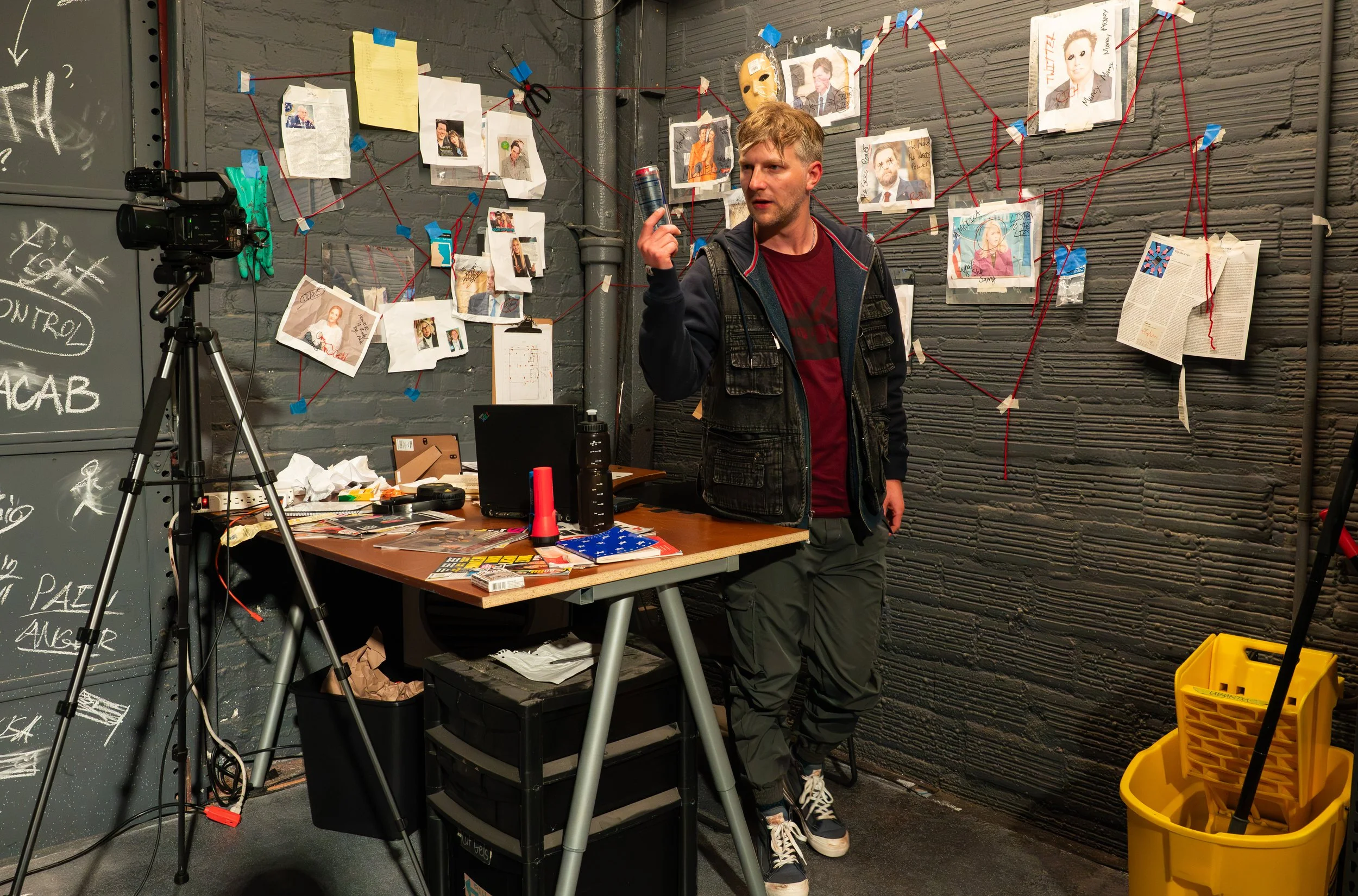 Thankfully, a character list tells us ‘who killed whom’ in this wildly imaginative one-man montage of U.S. history’s anti-heroes. Kudos to set designer Sam Fehr for his garage décor. The black-walled corner suggests a murderer’s man-cave, with red yarn linking mug shots, an open laptop, and chalk graffiti of a James Bond-like gunman. How many alienated young Americans are still plotting today?