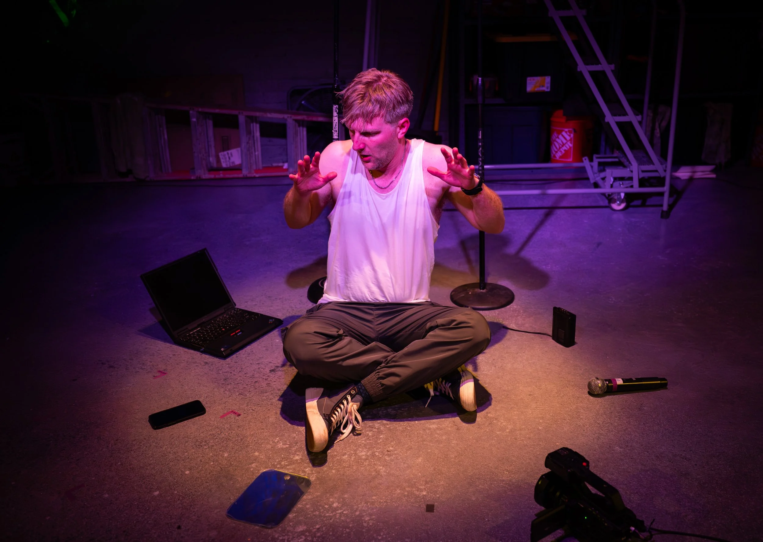 Grunge-styled Adam KuveNiemann paces the floor, glued to his cell phone. He becomes a variety of outcasts, revealing eerie similarities between assassins and near-assassins of our presidents. These citizens feel betrayed by their leaders and their lovers. With nothing left to lose, maybe notoriety could end their loneliness?
