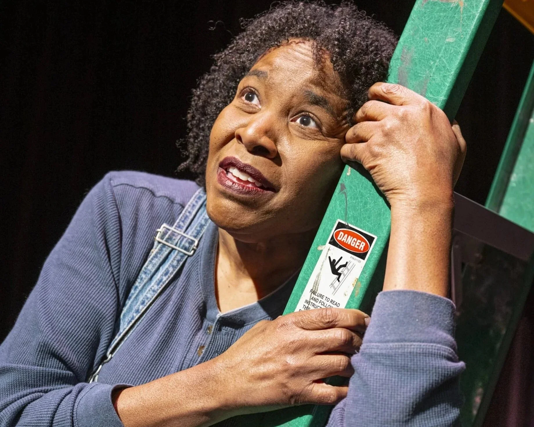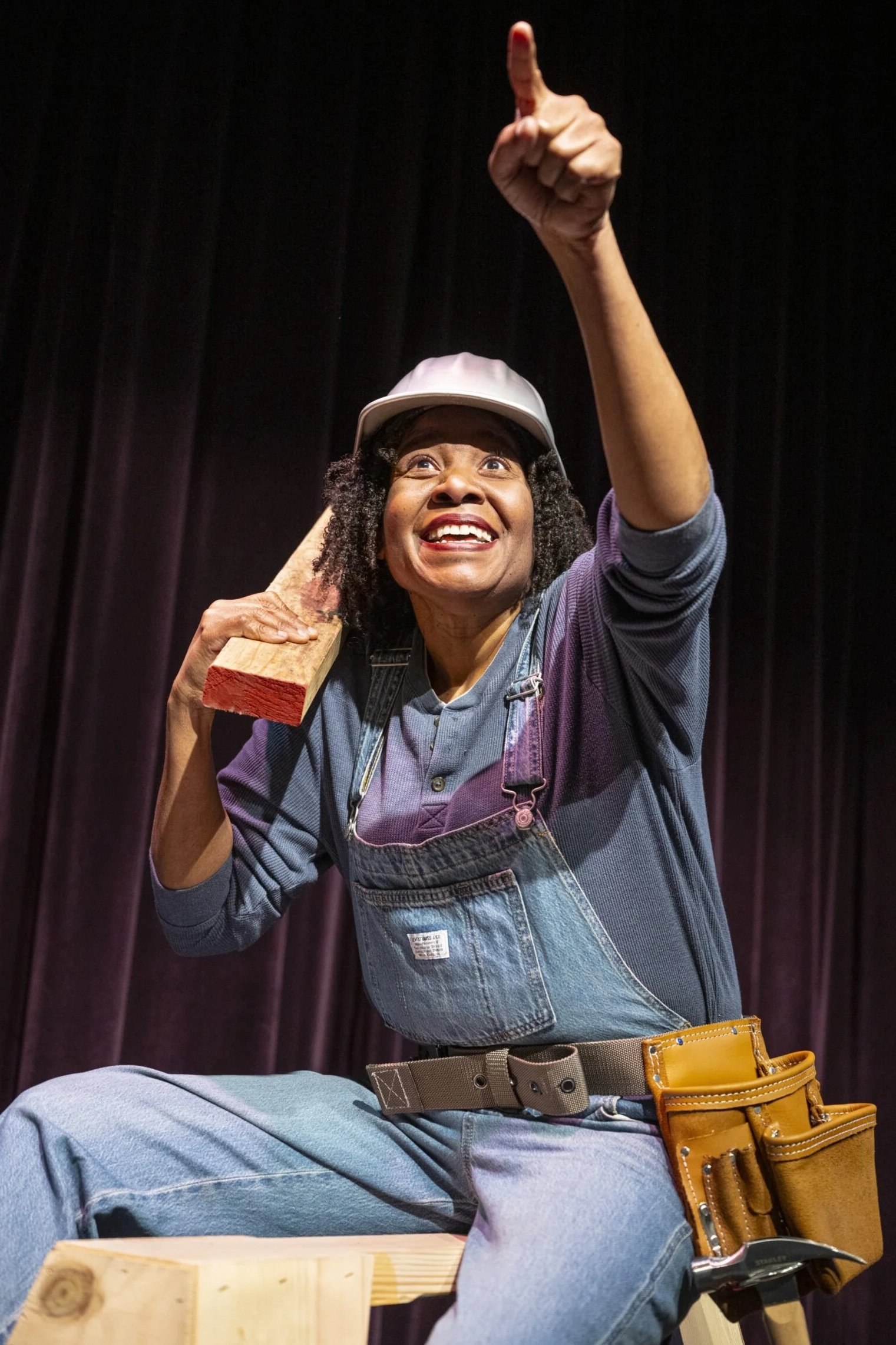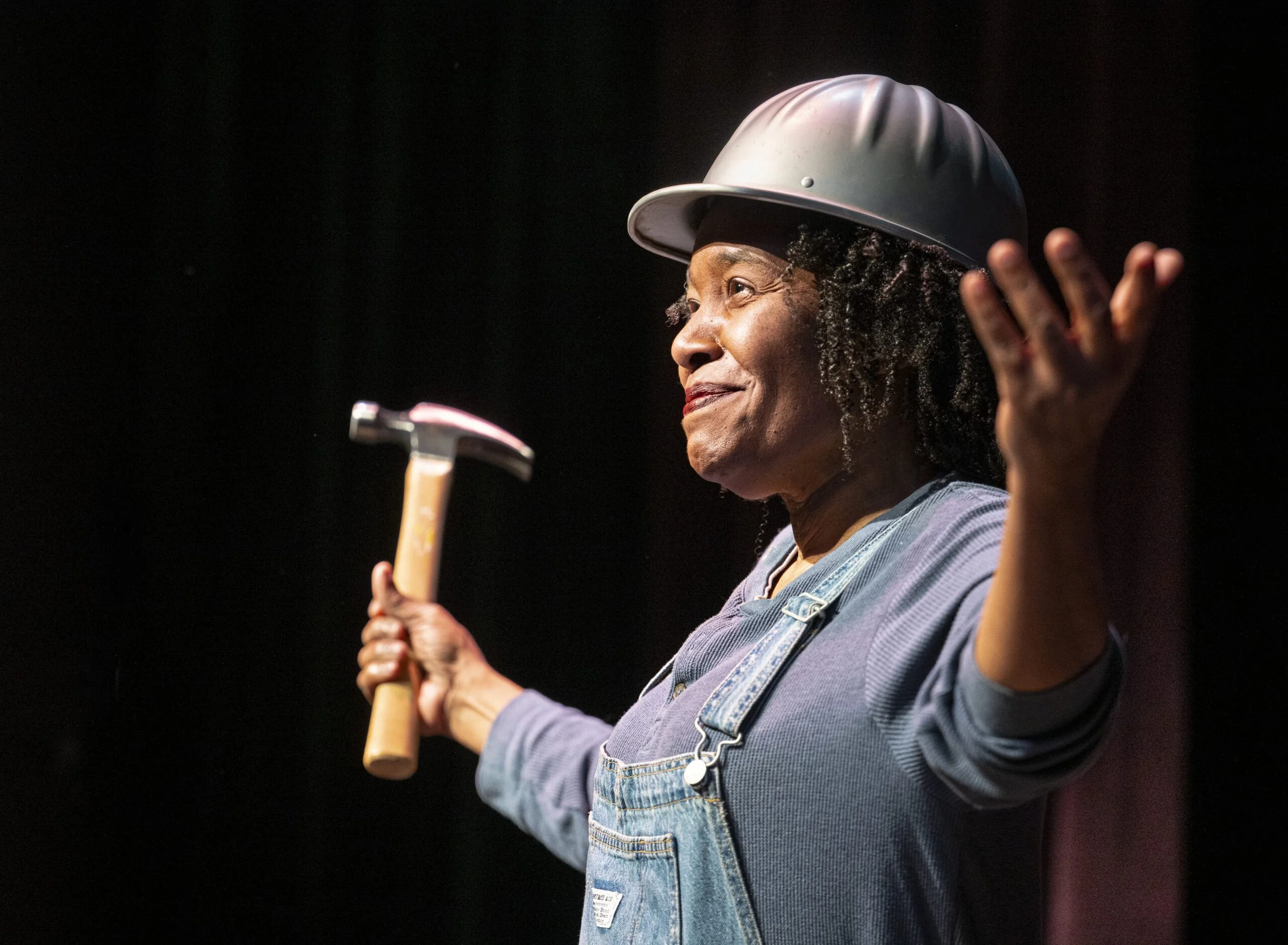 Onstage, a small ladder, a couple of boxes, and her dungaree overalls let us know that Pearl Louise is here to work. She does a terrific pantomime of hammering, pulling handfuls of nails out of huge boxes. She hoists walls, demonstrating the physical demands of the work, keeping her story moving. But one fight scene drags, and a dubious “hero” sends mixed messages.